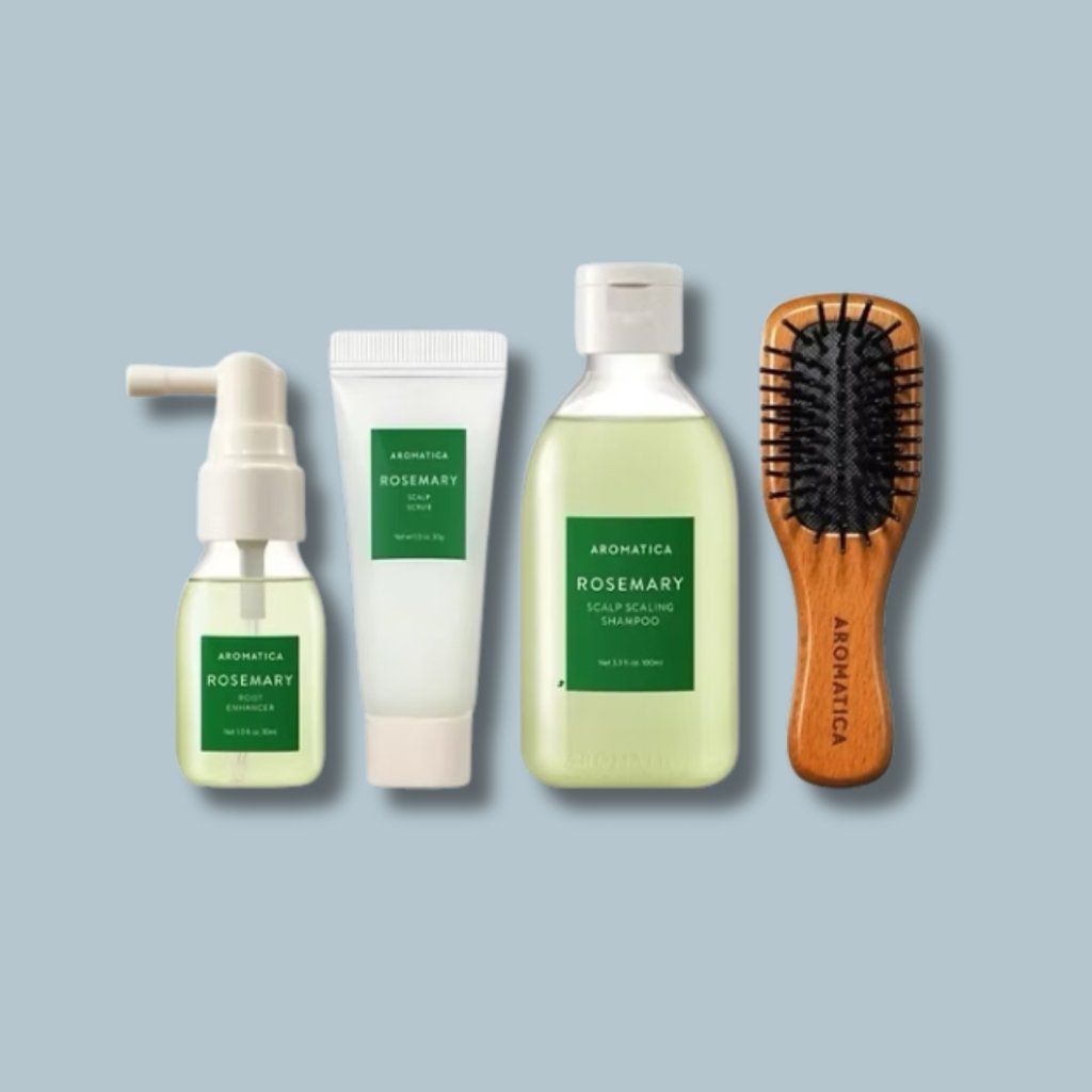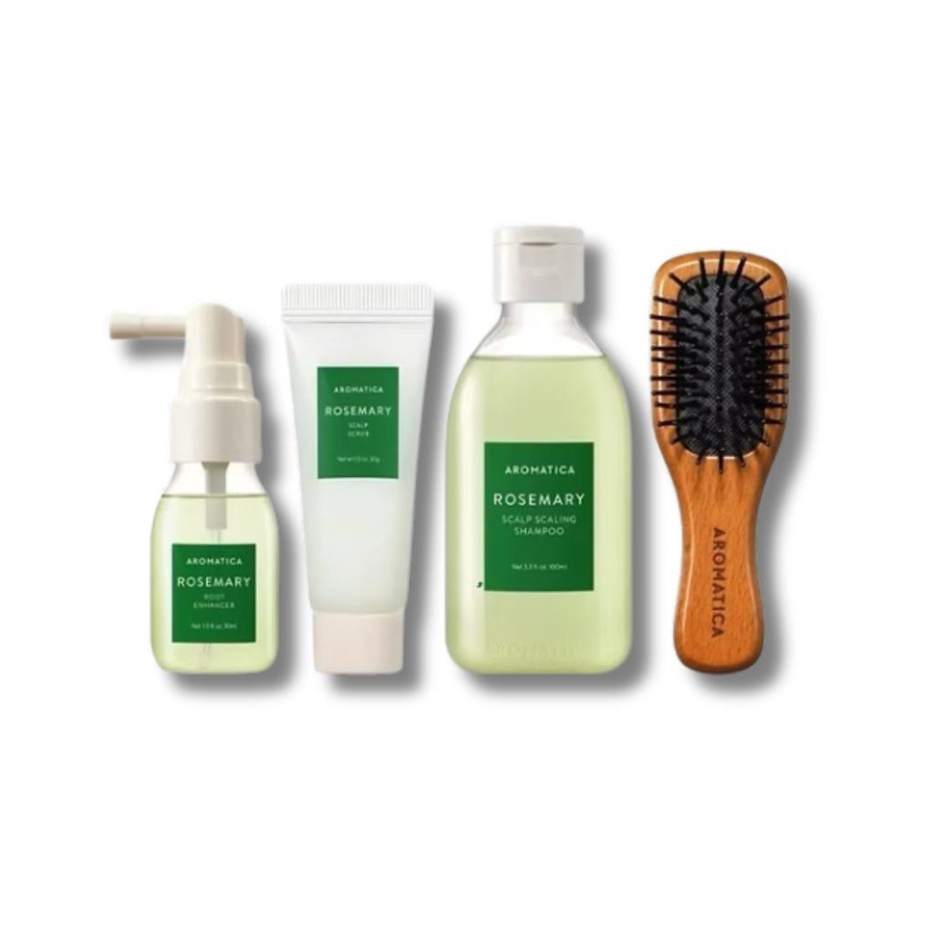 Aromatica Rosemary Scalp Scaling Trial Kit je ideální startovací nebo cestovní sada, která nabízí kompletní rutinu pro detox, obnovu a stimulaci vlasové pokožky. Obsahuje čtyři produkty, které dohromady fungují jako „scalp facial“ - tedy hloubkové čištění a regenerace pokožky hlavy.