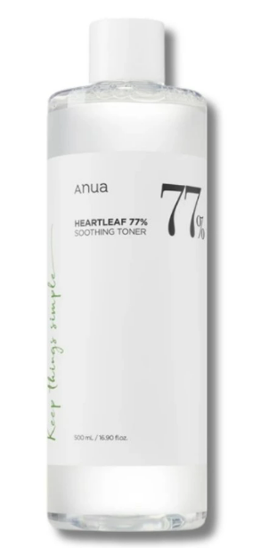 - Anua Heartleaf 77% Zklidňující toner – toner s 77 % extraktu z listů Heartleaf, známého svými zklidňujícími a čistícími vlastnostmi, ideální pro hydrataci a pomoc při zarudnutí