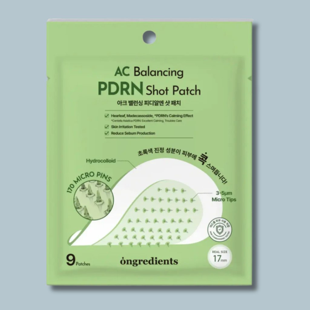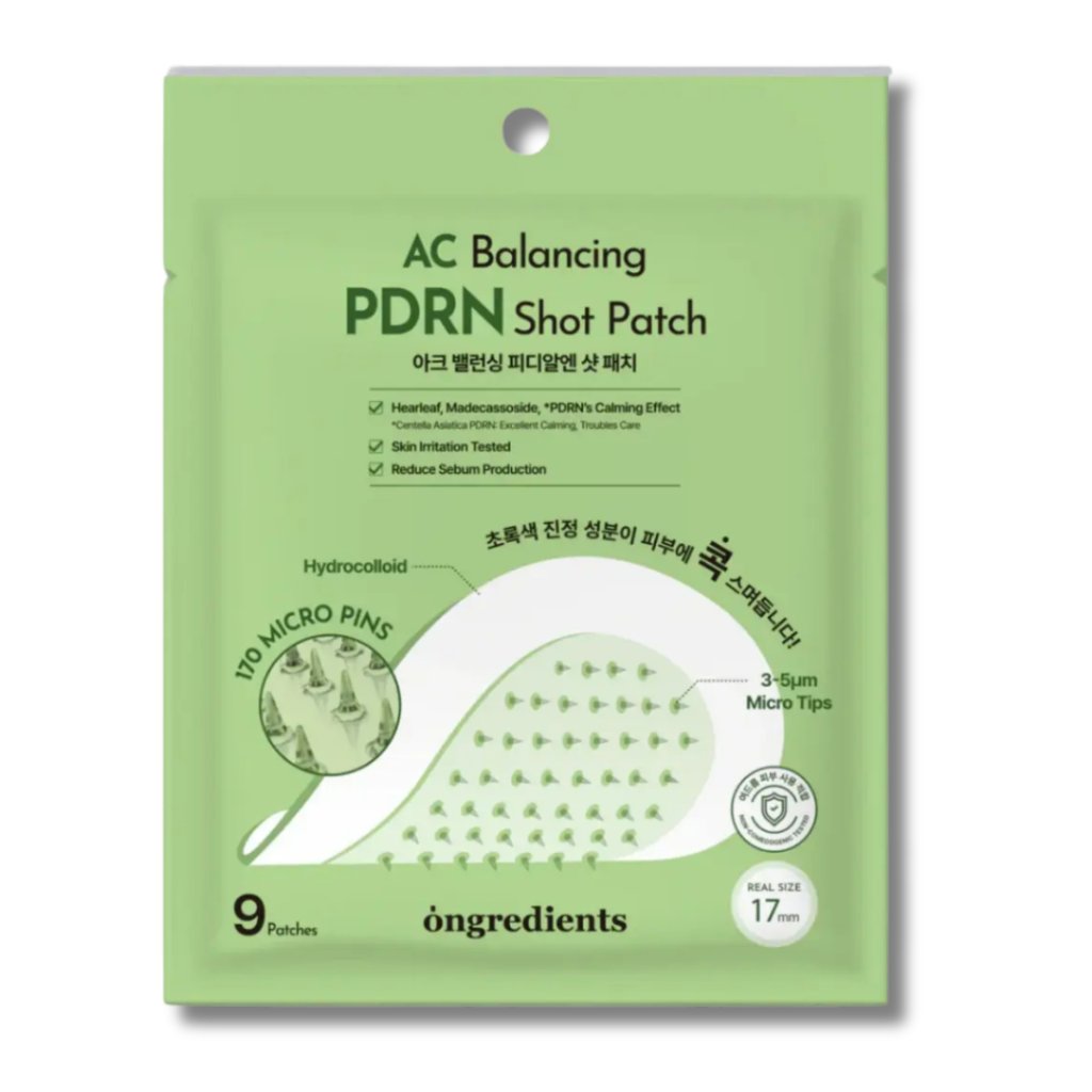 AC Balancing PDRN Shot Patch kombinuje hydrogelový kryt s mikročásticemi (spikulemi), které jemně pronikají do pokožky, aby podpořily rychlou penetraci účinných látek – včetně PDRN (Polydeoxyribonucleotide) – látky známé pro svou regenerační schopnost, protizánětlivý účinek a podporu opravy tkání. Patch dále obsahuje Heartleaf extract(Houttuynia Cordata) a Madecassoside pro antibakteriální účinky a zklidnění, Centella Asiatica pro hojení i bariérovou podporu, aromaterapeutický Panthenol a Sodium Hyaluronate pro hydrataci, spolu s výživnými antioxidanty a emoliency (např. trehalóza, glycerin). Náplast je hypoalergenní, bez parfemace, vhodná i pro pleť s rozšířenými póry, citlivou i aknózní.